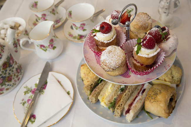 The Afternoon Tea includes a sandwich, a freshly baked scone with strawberry preserve and clotted cream, and a choice of cake. If you have Afternoon Tea for Two (£29.90) your treats will be served on a traditional tiered serving plate.https://bantamtea-rooms.co.uk/about-the-tearooms/