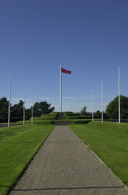 The traditional Tynwald Day events begin when the parade of dignitaries gather to march along the processional route lined with flagpoles to St John's Chapel. The Lieutenant Governor arrives around 10.40am, receives the Royal Salute and inspects the Guard of Honour. He is preceded in the parade by a sword-bearer in a red uniform who carries the official 15th century Sword of State. A wreath is laid at the National War Memorial before the official service begins at 11am.