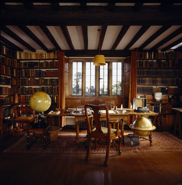 The dining room is still decorated with the rich 18th century Cordoba leather wall hangings of exotic birds and foliage bought on a visit to the Isle of Wight. The study is just as Kipling left it, with the ink stained desk, Good Companion typewriter which he claimed "simply won't spell", his pen nibs, library and day bed.