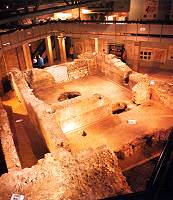 The walls in four rooms survive to a height of 4-6ft. and the hard red concrete floors cover substantially complete central-heating systems. Visitors can see the large arched flues, the various heating channels and the vertical wall-flues that kept the building comfortably warm 1,800 years ago.