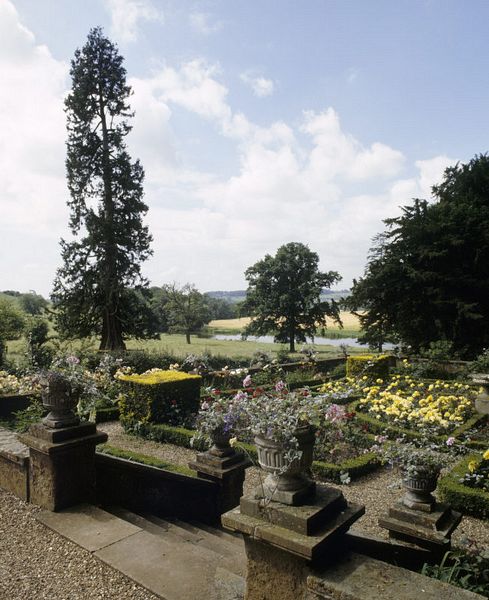 At the front of the hall the landscape rolls down to a long ornamental lake in the valley and a grassy terrace runs for 1.2 km along a ridge hedged with laurel, wide enough for two horse-drawn carriages to pass. It is adorned with Sanderson Miller's eye-catchers: a pedimented Ionic temple; a two-storey domed pavilion with a curving staircase, and an obelisk, sadly defaced by Italian prisoners when the hall was used as a military hospital during World War II.