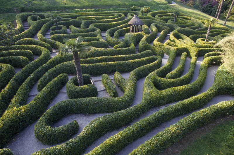 Set in a sheltered wooded valley it has several unique features, including the serpentine maze which, when viewed from the opposite side of the valley looks like a giant coiled serpent lying up the sloping garden.