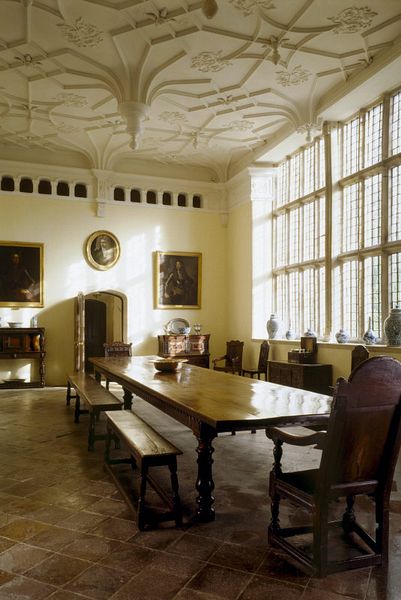The weathered limestone house has a Great Hall lit by a two-storey high window to the left of the main entrance. It has an intricate lattice of mullions and transoms supporting the 576 panes of glass, many of which are the original glass which was made in