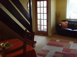 Fully fitted modern kitchen with gas cooker,fridge, washing machine and tumble dryer. Open plan leading to cosy reading room with settee and electric fire. Rear door to garden.
