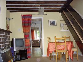 Open beam ceiling with brick fireplace housing a gas fire, leather settee and dining area. Colour TV, DVD player and selection of music and films.