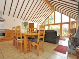 The general appearance is of oak the front window is a main feature with the theme being carried in to the kitchen and dining furniture, it is a large open plan barn style living area with 2 ensuite bedrooms leading off the main room. There is an open woodburner which is very effective and gives the room a cosy feel.