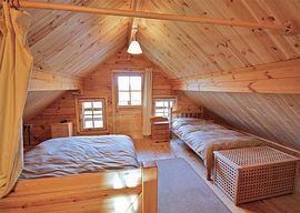 Upstairs there are two large bedrooms, both with private verandas overlooking the orchard at one side and the path and garden at the other side. Both berooms have a double bed and a single bed giving you maximum flexability.