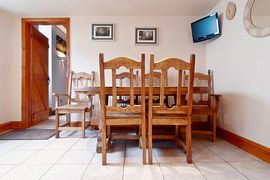 The kitchen is spacious and modern with an attractive oak dining table and wall-mounted flat screen television. It has an electric oven, hob, microwave, fridge, kettle, toaster, sandwich maker, and a full range of pans, crockery and cutlery.