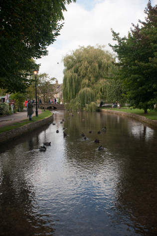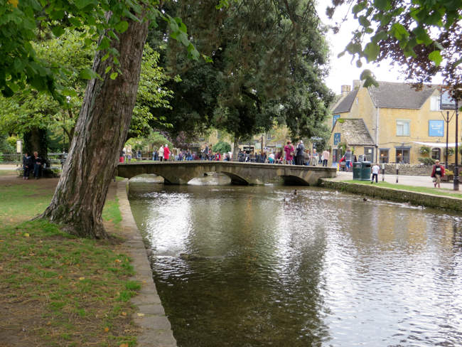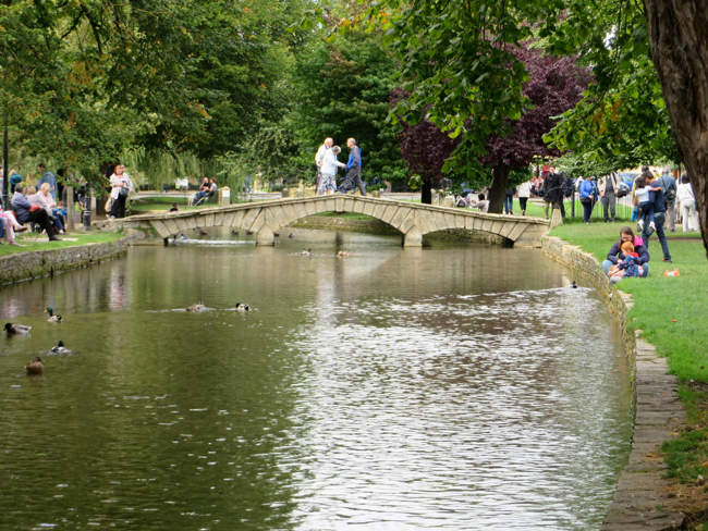 The sparkling clear water of the River Windrush flows through the main street, with trees shading the wide lawns on either side, and low ornamental arched bridges spanning the river at intervals as crossing places.