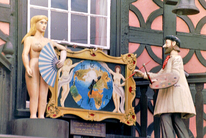 Next door to the Time Machine Museum of Science Fiction is an art shop which has been in the same family for several generations and the artist founder of the dynasty has been commemorated with a risque clock!