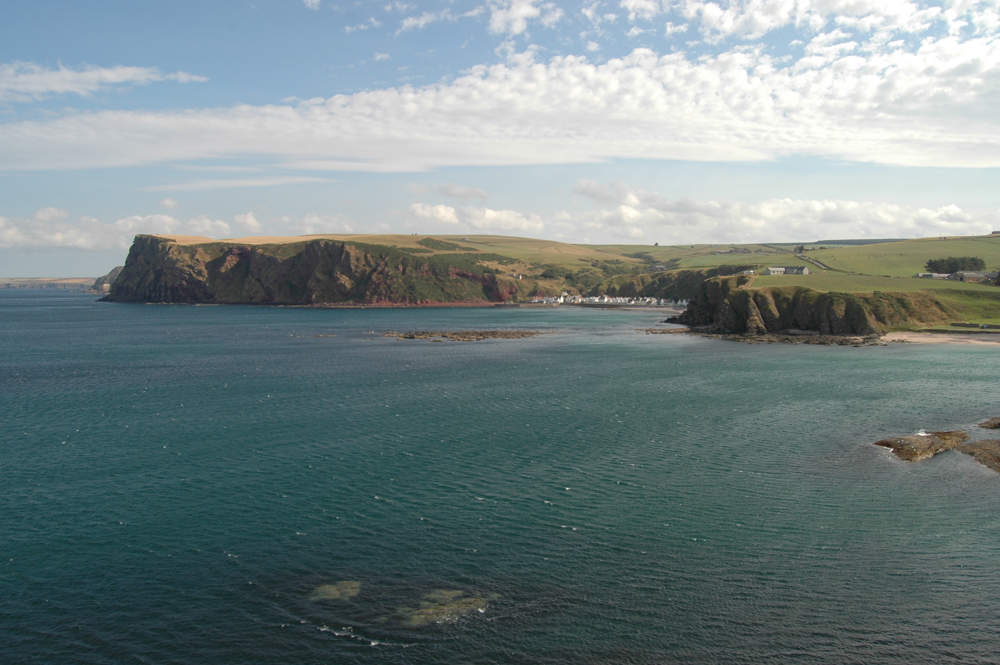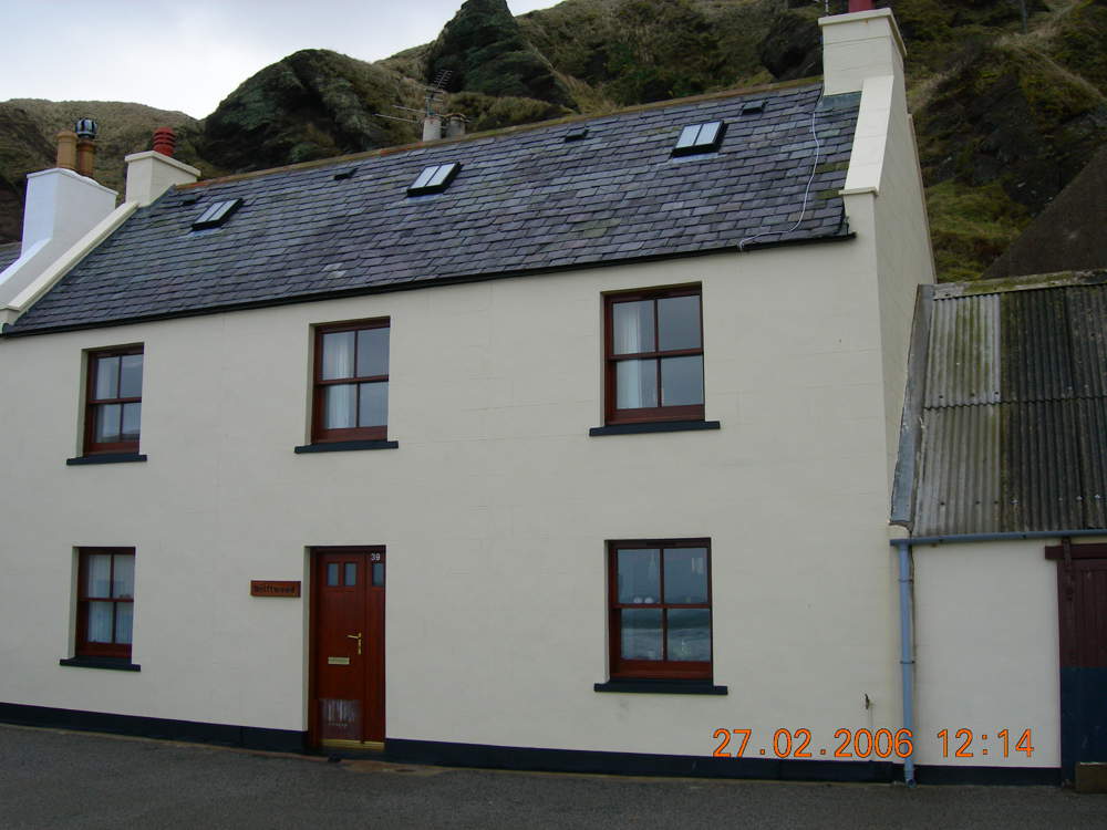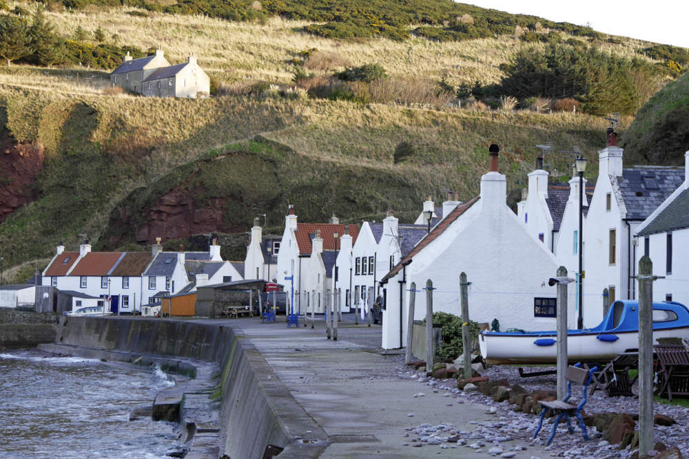 The buildings are mostly cream and magnolia coloured or natural red sandstone.There are about 35 quaint cottages spread along the village's single street, some dating back hundreds of years to when it was a fishing village and typical of this part of Scotland.The village is at the base of imposing cliffs and although originally a fishing village where everyone, including the women and children, played a part in preparing nets and gutting the catch, it also became famous for the mining of sandstone from the surrounding cliffs, for wheels for grinding corn in wind and water mills around the highlands of Scotland.